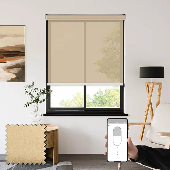 Motorized Blinds in neutral earth sheer voile, battery-powered for cordless operation. Light-filtering with smart control via timer, handset, or mobile app, offering privacy, view out, and effortless convenience.