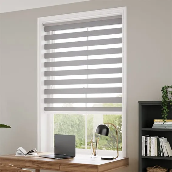 Thunder Grey Zebra Blinds feature alternating sheer and solid fabric stripes for smooth light and privacy control. Adjust layers to filter daylight or create full coverage. Made to measure with a durable aluminium tube and easy top or face fitting installation.