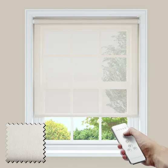 Motorized Blinds in frost white voile with battery-powered operation. Light-filtering and cordless, controlled via handset, providing privacy, clear view out, and effortless functionality.