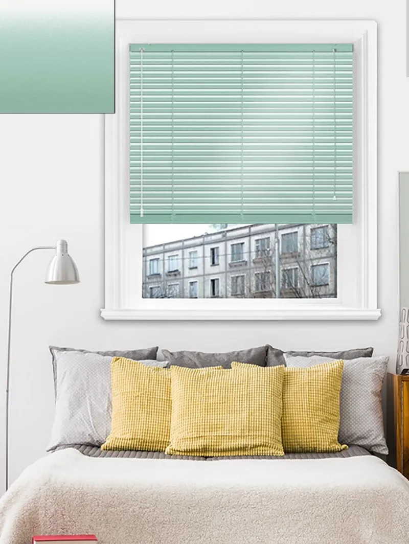 A pastel green aluminium venetian blind that adds a natural and calming touch to any room.