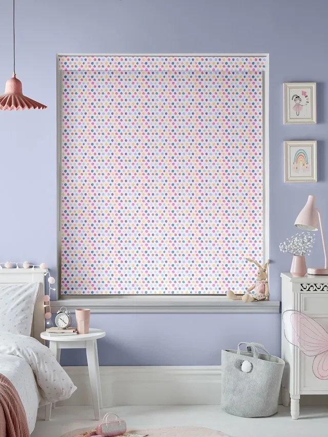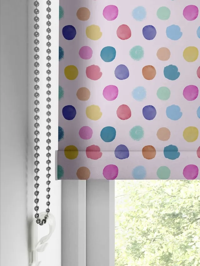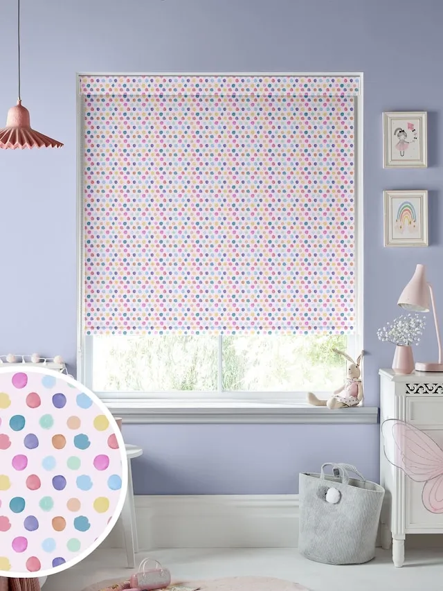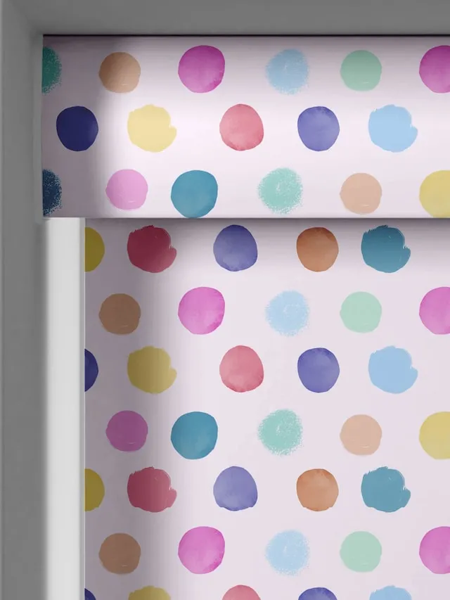 Kids Room Blinds with a colorful dotty pattern on textured blackout fabric. Designed to block light and add a fun, vibrant touch, the made-to-measure roller blind offers a neat fit and smooth operation for children’s rooms.