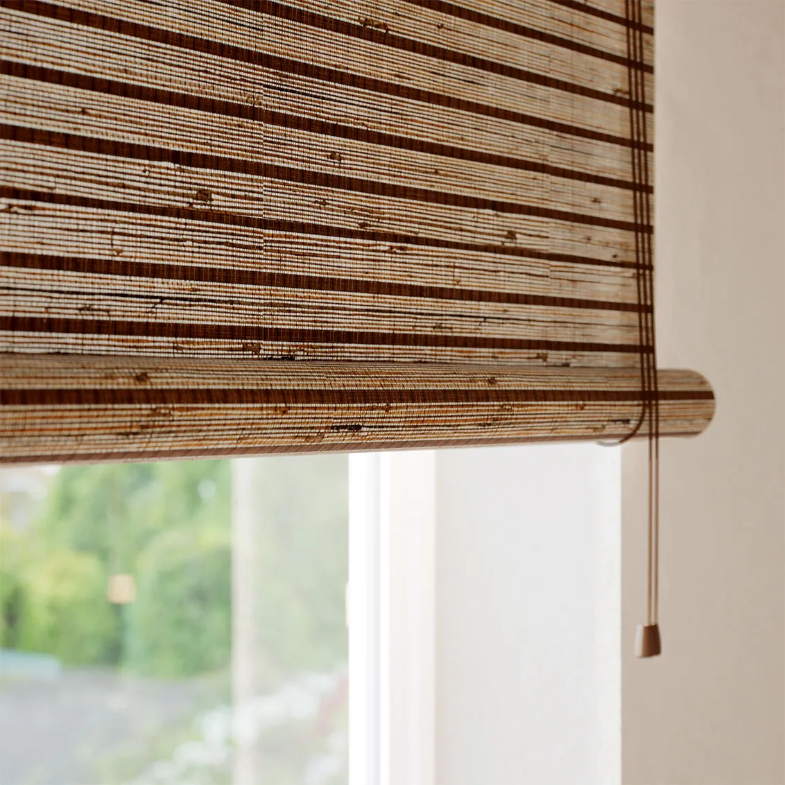 Rustic yet sophisticated roll-up blind crafted from bamboo and jute. Its striped pattern with intricate threadwork adds texture and warmth, fully custom-made for effortless light control and natural elegance in any room.