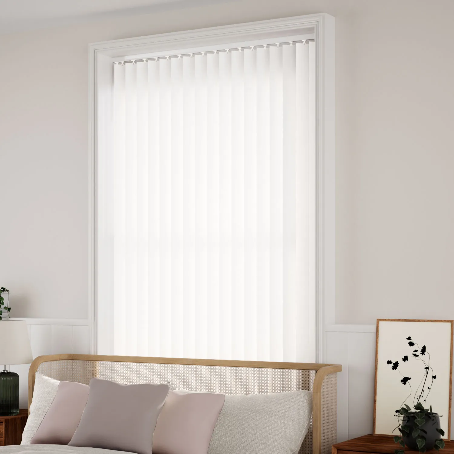Crisp white vertical blinds with moisture-resistant fabric. Adjustable louvres provide light control and privacy, ideal for kitchens, bathrooms, large windows, and patio doors.