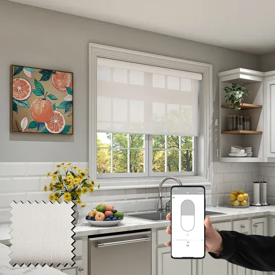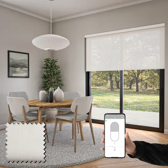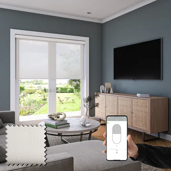 Motorized Blinds in white voile with battery-powered operation. Light-filtering, cordless, and smart-controlled via timer, handset, or mobile app, providing privacy, view out, and effortless control.