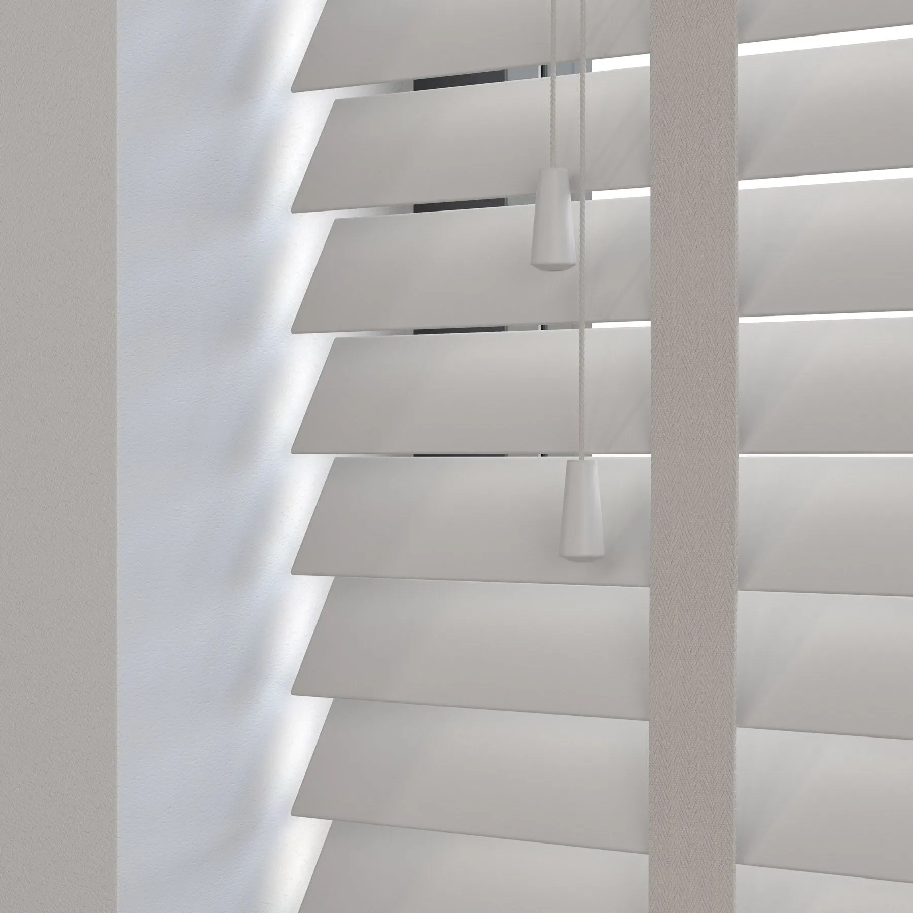 Add timeless style with Steel Grey Wooden Blinds crafted from real wood. Featuring 50mm slats and decorative tapes, they offer excellent light and privacy control. Durable, easy to wipe, and ideal for living rooms, dining areas, and offices.